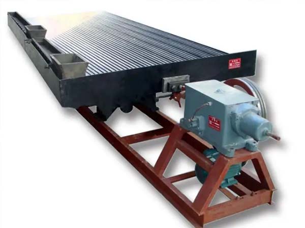 搖床是用于選別細(xì)粒物料的重力選礦設(shè)備,廣泛應(yīng)用于選別錫、鎢、金銀、鉛、鋅、鉭、鈮、鐵、錳、鈦鐵和煤等。選礦搖床通常是由床面、機架和傳動機構(gòu)三大部分組成。除此之外還有沖水槽,給礦槽,機座等,整個床面由機架支撐或吊起,機架上裝有調(diào)坡裝置。選礦搖床可以使礦粒按其密度和粒度不同而沿不同方向運動,并從給礦槽開始沿對角線呈扇形展開,依次沿床面的邊沿排出,排礦線很長,能產(chǎn)出多種質(zhì)量不同的產(chǎn)物。選礦搖床具有富集比高、選別效率好、操作簡單。與傳統(tǒng)工藝相比,搖床設(shè)備具有不用藥劑、耗能低、便于管理等優(yōu)點。